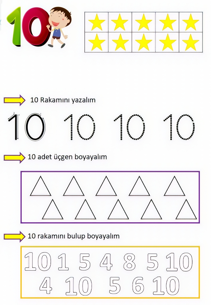 Tekrar: Farklı türde alıştırmalarla 10 rakamının sürekli tekrarı, kalıcı öğrenmeyi destekleyecektir.