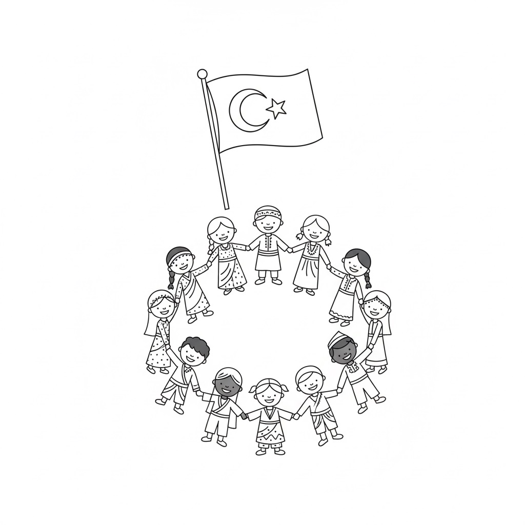 Detay Dengesi: Resim, çocuğu yormayacak kadar sade ama hayal gücünü besleyecek kadar (yıldızlar, bayrak, farklı çocuk figürleri) detay içerir.