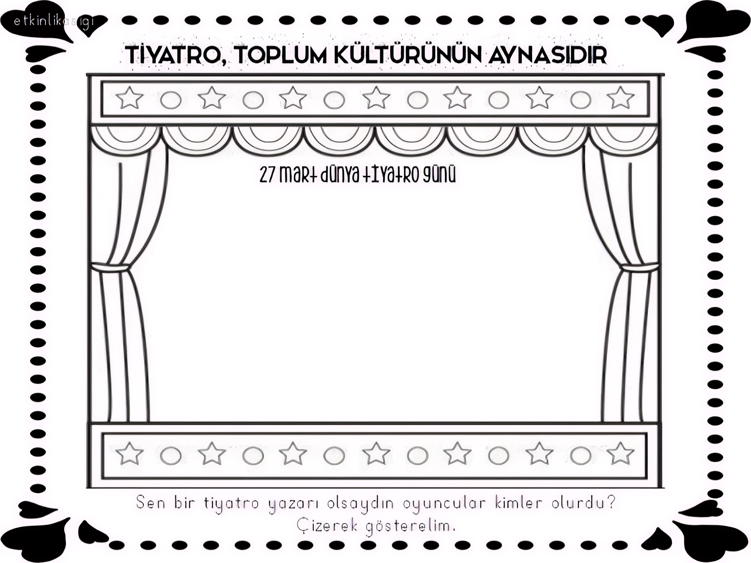 Okul öncesi tiyatrolar günü etkinlikleri sanat etkinlikleri ve boyama çalışmaları aşağıda listelenmiştir. HD yüksek kalitede indirip çıktı alabileceğiniz formatta hazırlanmıştır.